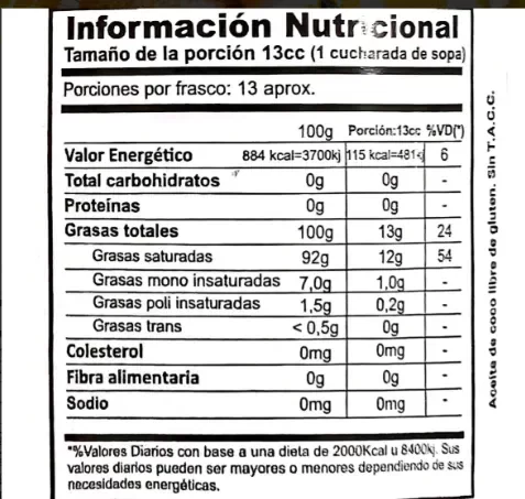 Características principales: - Presentación práctica de 200cc. - Sabor neutro que no altera el gusto de tus preparaciones. - Alto contenido de ácidos grasos saludables. - Procedente de coco natural, sin aditivos ni conservantes.