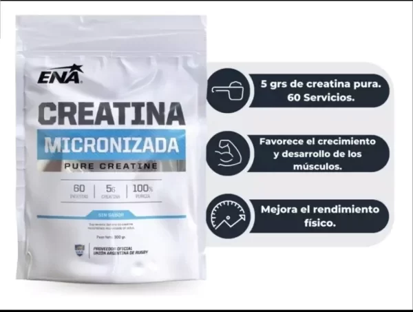 La Creatina Micronizada de ENA disminuye la fatiga luego de la actividad y ayuda al aumento de la fuerza muscular. Rápida absorción + Energía inmediata.