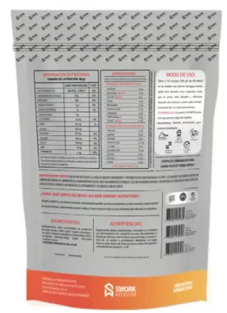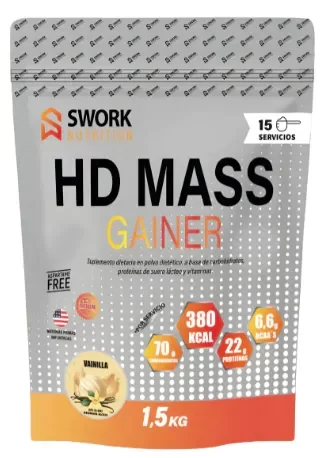 HD MASS GAINER SWORK NUTRITION X 1.5 kg (15 servicios) ENVASE DOYPACK SUPLEMENTO DIETARIO EN POLVO DIETETICO, A BASE DE CARBOHIDRATOS, PROTEINAS DE SUERO LACTEO Y VITAMINAS. POR SERVICIO APORTA: 70 GR CARBOHIDRATOS 380 KCAL 22 GR DE PROTEINAS 6.6 GR BCAA´S HD MASS GAINER DE SWORK NUTRITION te aporta todo lo que necesitas para aumentar tu masa muscular, tonificar y mejorar tu rendimiento. >Algunos de los beneficios: *Aumento de masa muscular *Aumento de fuerza y energía *Mejora el rendimiento
