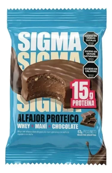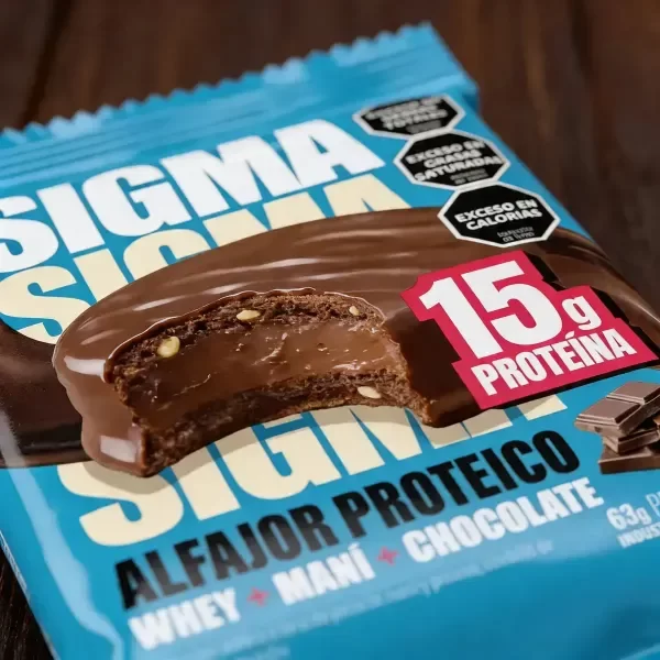 El Alfajor Sigma con proteína es un producto de confitería clasificado dentro de la línea de alfajores, cuya composición técnica se centra en el aporte de macronutrientes, específicamente proteínas. El producto presenta una formulación estandarizada con sabor a chocolate. Desde una perspectiva bromatológica, cada unidad de 63 gramos constituye una unidad de consumo individual diseñada para proporcionar una densidad energética específica mediante la combinación de sus ingredientes base. El producto no se clasifica como libre de gluten, lactosa o azúcares, manteniendo los componentes habituales de esta categoría de alimentos. La presentación técnica contempla un formato de distribución en unidades múltiples, garantizando la estabilidad de los componentes mediante un envasado hermético.