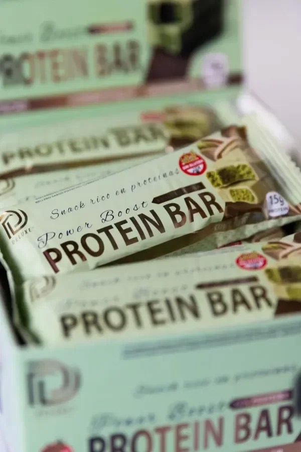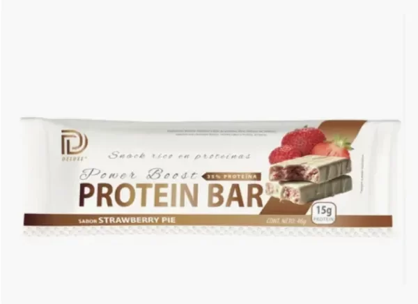 Barras de Proteína Deluxe Power Boost -Potenciá tu día con energía y sabor. Las barras de proteína Deluxe Power Boost son ideales para quienes buscan rendimiento, nutrición y un snack saludable sin sacrificar el gusto. -CARACTERISTICAS PRINCIPALES: 35% de proteína por barra 15 g de proteína por unidad- Peso por unidad: 46 g SABORES DISPONIBLES: -Strawberry Pie (Barrita de frutilla cubierta de chocolate blanco) -Chocolate Info nutricional por porción (1 barrita) 201 Kcal 24 gr CARBOHIDRATOS, de los cuales: 16 gr AZUCARES TOTALES 16 gr AZÚCARES AÑADIDOS 15 gr PROTEÍNAS 5 gr GRASAS TOTALES 0,5 gr GRASAS SATURADAS 0 gr GRASAS TRANS 0 gr FIBRA ALIMENTARIA 72 mg SODIO Aviso legal • Edad mínima recomendada: 18 años. • Este producto es un suplemento dietario, no es un medicamento. Suplementa dietas insuficientes. Consulte a su médico y/o farmacéutico.