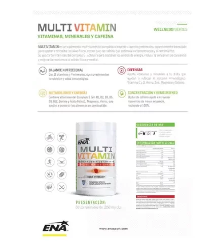 MULTIVITAMIN es un suplemento multivitamínico completo a base de vitaminas y minerales, especialmente formulado para ayudar a respaldar la salud física, con un plus de cafeína que estimula la concentración y el rendimiento. Su aporte de Vitaminas del complejo B, colabora para sostener los niveles de energía, reducir la sensación de cansancio y mejorar al resistencia al estrés físico y mental.