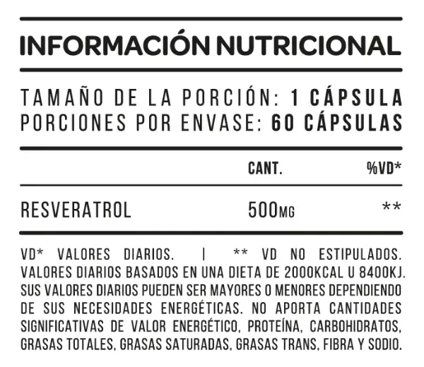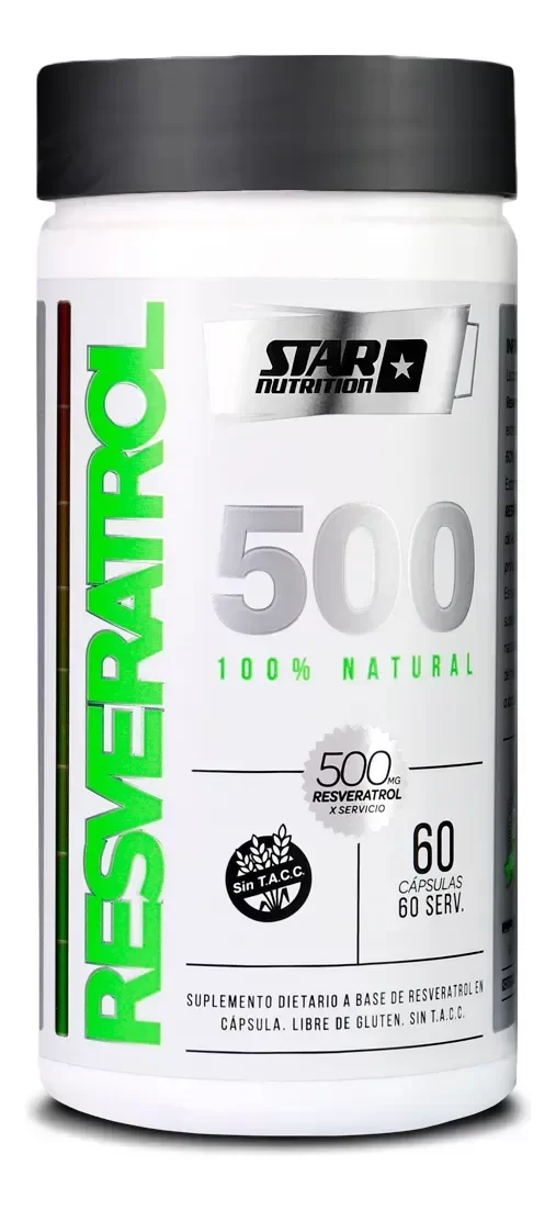 RESVERATROL 500 Suplemento dietario a base de Resveratrol 500. 60 CÁPSULAS | 60 SERV. 500MG DE RESVERATROL X SERV. Información importante La concentración de Resveratrol y Trans Resveratrol obtenida a partir de nuestro extracto de uva es estandarizada al 60% y 54% respectivamente. Esto convierte a Star Nutrition Resveratrol 500 en un producto de altísima concentración del principio activo. Es fundamental a la hora de elegir un suplemento dietario a base de extractos naturales, conocer la concentración del mismo, ya que hace directamente a la calidad.