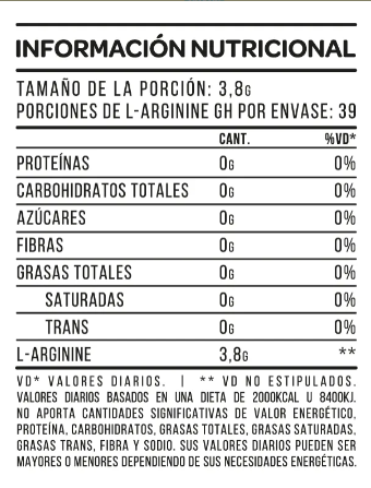 L-Arginine GH ayuda a conseguir un mayor rendimiento y una sensación agradable en los músculos para el momento de entrenar. Contiene 6 gr. de L-Arginina por servicio. Posee 39 servicios de 3.8 gr Mezclar 1 porción con 280 ml. de agua, leche o la bebida de tu preferencia. Dias de Entrenamiento: 1 servicio 1 hora antes de entrenar Dias de Descanso: 1 servicio 1 hora antes del desayuno